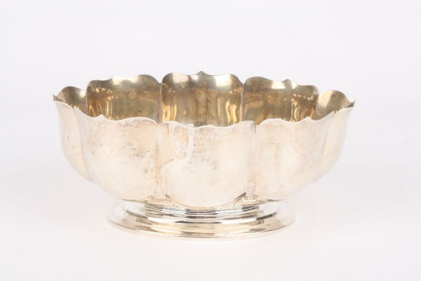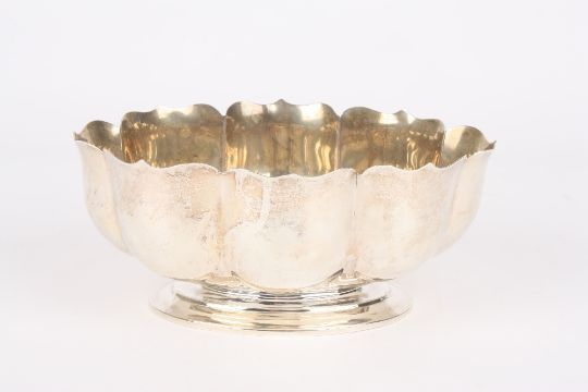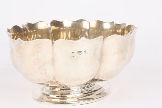 An Edwardian silver eight lobed petal bowl, hallmarked London 1902, with makers mark: CE, supported on an oval base. 9.2 ozt. 20cm wide . Good condition, no damage.