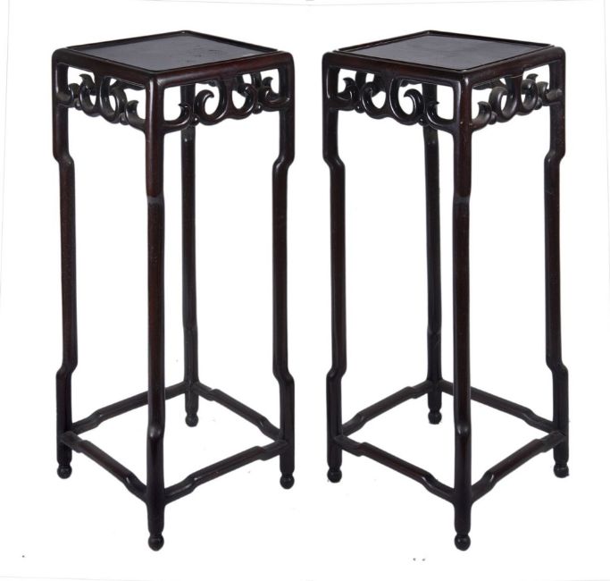 A pair of Chinese hardwood stands, with fretted to decoration, 95cm high, 37cm wide . The fretted section appears to be broken in a couple of places and restored, but overall in good solid condition
