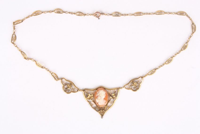 A Victorian pinchbeck cameo necklace, with pierced filigree decoration and oval cameo portrait, the chain with smaller pierced panels . Plate wear in places.