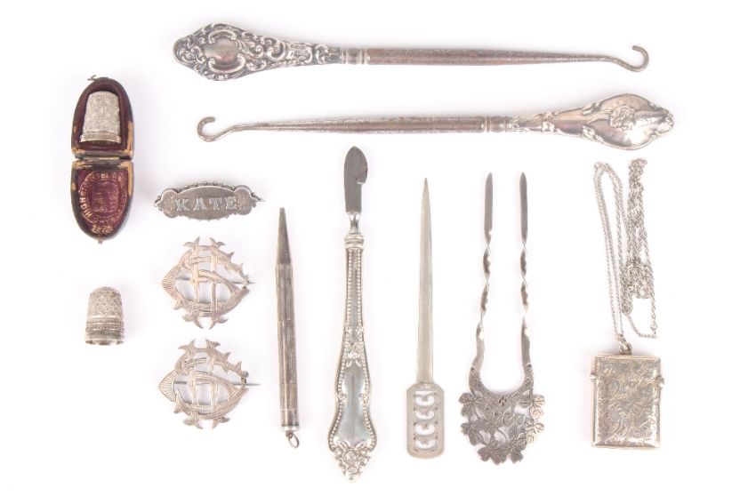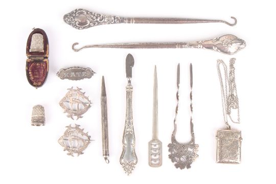 A small collection of silver items, including two button hooks, two thimbles, three brooches, two hair pins, vesta case, pencil and tool -12 . Generally good condition.