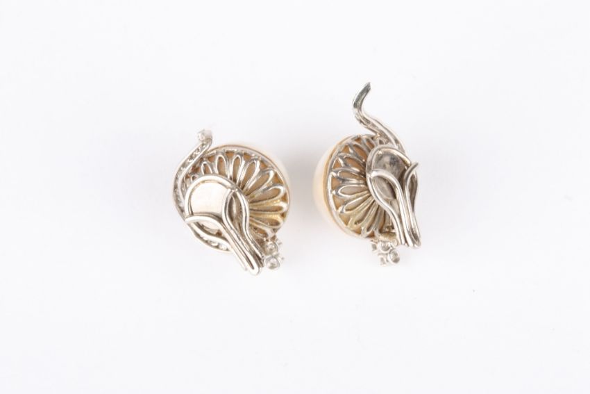 A large pair of pearl and diamond earrings, each set with a large central pearl and crested with a trio of diamonds, with crescent surrounds and set in unmarked white metal with clip fittings. Pearls approx 15mm diameter . Generally in good condition.