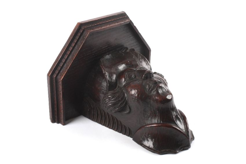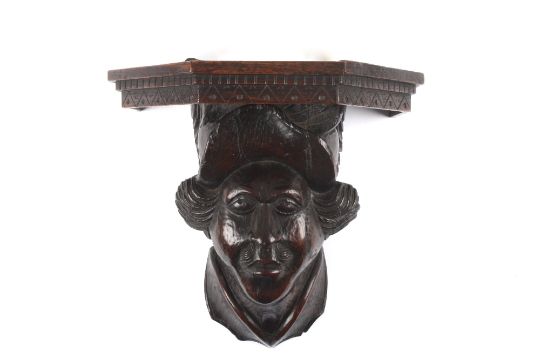 A carved oak figure of a Cavalier’s head, probably 17th century underneath a 19th century shelf, height 27cm . The cavalier is richly coloured and well carved, with good patination. Overall in good condition