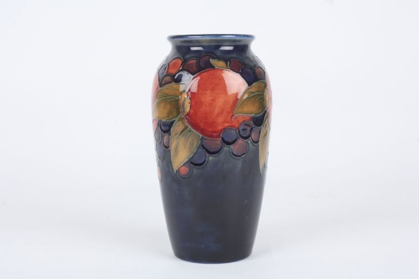 A William Moorcroft Pomegranate vase, decorated with leaves, berries and pomegranates on a blue ground. Impressed mark and signed in green to base. 18.5cm high . Hairline crack to the top of the rim. and 1cm faint glaze crack to the inside of the rim.
