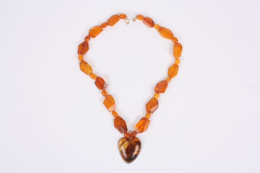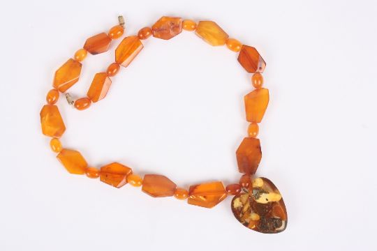 An amber necklace with heart shaped pendant, the Baltic amber necklace with angular shaped amber beads interspersed with smaller rounded beads, length 50cm . Some of the larger beads with small surface chips, in fair condition. One with hole.