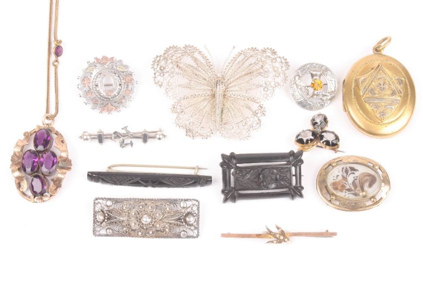 A collection of assorted brooches and jewellery, including silver filigree brooches, a pendant locket, silver brooches and other brooches. -12 . One brooch with pin missing, most with some wear.