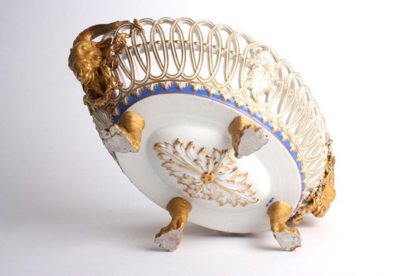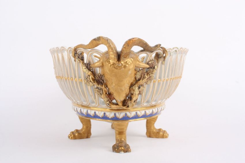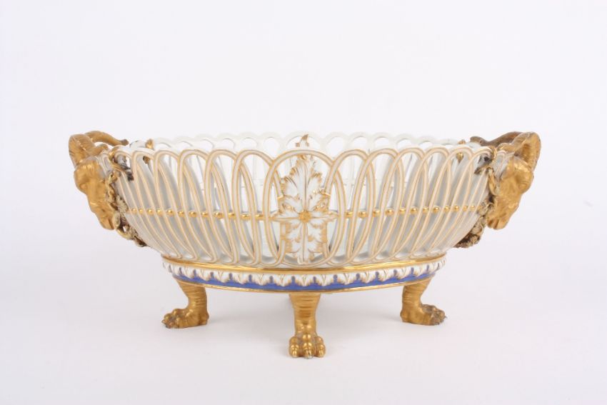A mid to late 19th century Berlin porcelain oval basket, of pierced design, each end with gilded rams head mask above a blue and gilt acanthus rim and supported on four claw feet. With blue sceptre mark to base. 33cm wide . Restoration to horns and feet.