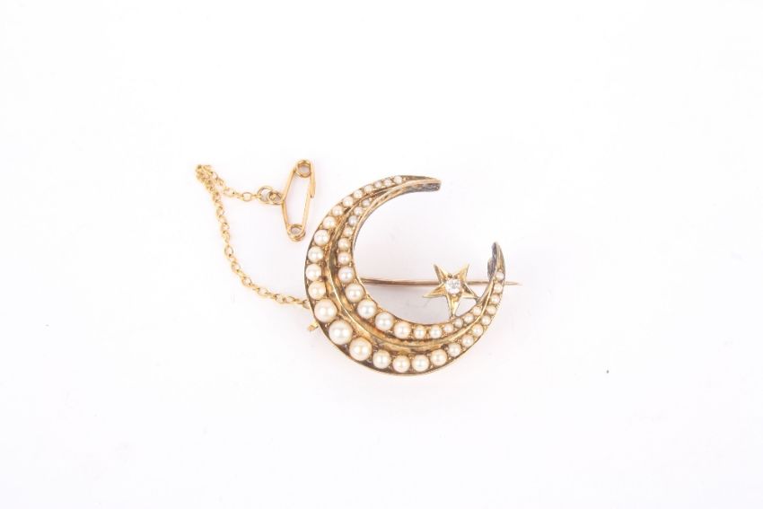 A Victorian seed pearl, diamond and gold coloured metal crescent brooch, decorated with two rows of graduated seed pearls and star mounted with diamond to centre, with safety chain, unmarked, 7.5g . In good overall condition