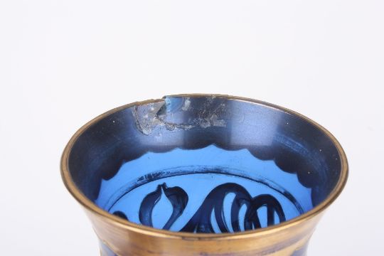 A pair of Art Nouveau glass vases, the royal blue coloured vases with gilt painted tube lined decoration of stylised flowers and tendrils, height 28cm . One of the vase is is broken around the rim and has been restored but still has a slightly rough edge. The broken edge is approximately 2.5cm in length. some of the gilt paint is a little worn in places.