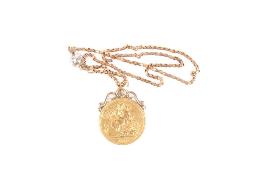 A gold two pound piece, dated 1902, with attached mount, on a 9ct gold chain, 26.9g .