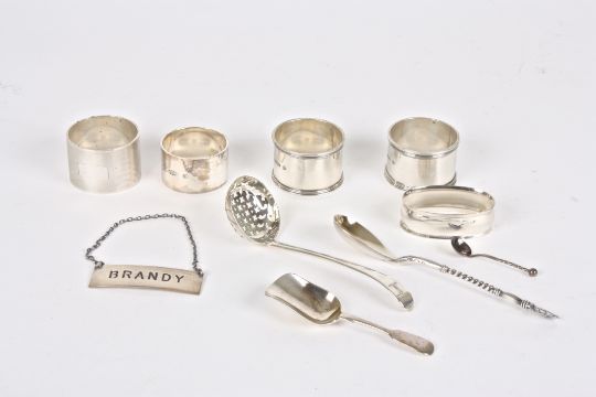 A collection of assorted silverware including napkin rings, a decanter label, caddy spoon and other spoons.Dimensions: Approx 8.7 ozt.Condition reportGenerally good condition.