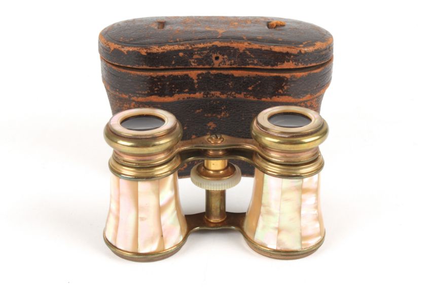 A pair of mother-of-pearl and brass opera glasses in fitted leather caseDimensions: Condition reportGlasses appear fine, but leather case with some wear.