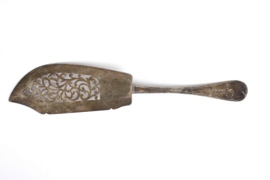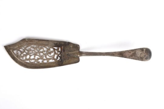 A Victorian Old English pattern silver fish slice hallmarked 1857, with threaded, pierced and scrolled blade and beaded handle with engraved crest. Makers mark: Chawner & Co.Dimensions: 5.95 ozt.Condition reportGood condition.