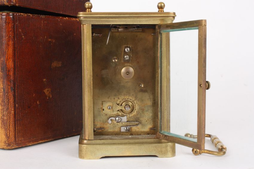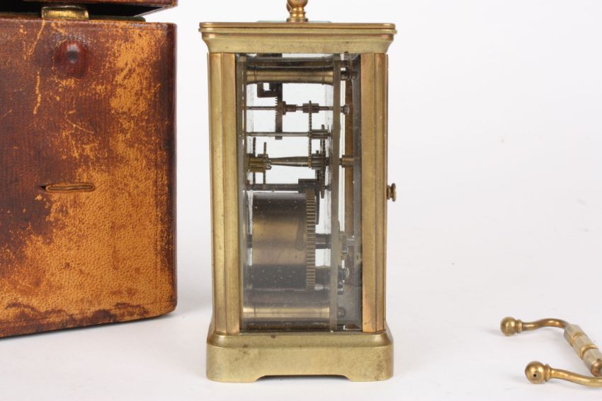 A French brass carriage clock retailed by Drew & Sons, Piccadilly Circus, London, the plain brass case with white dial and black Roman numerals, for repair. In a leather travelling case.Dimensions: Case 11 cm high.Condition reportHandle loose, minute hand detached, case tarnished, movement not tested. Carry case worn in places.