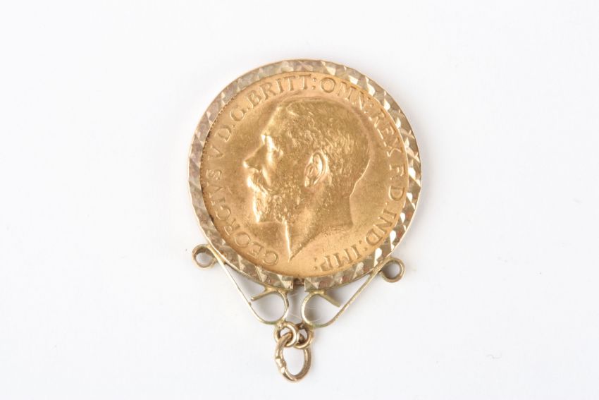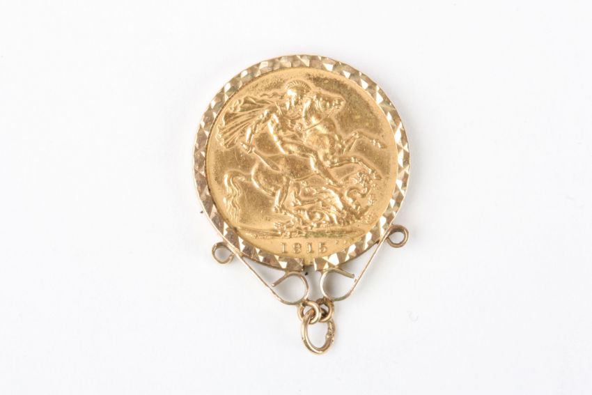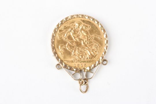A George V 1915 22ct gold full sovereign in a 9ct gold pendant mount.Dimensions: 9.4 grams.Condition reportGood condition.