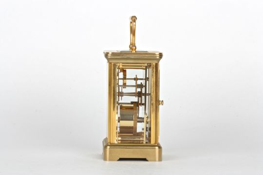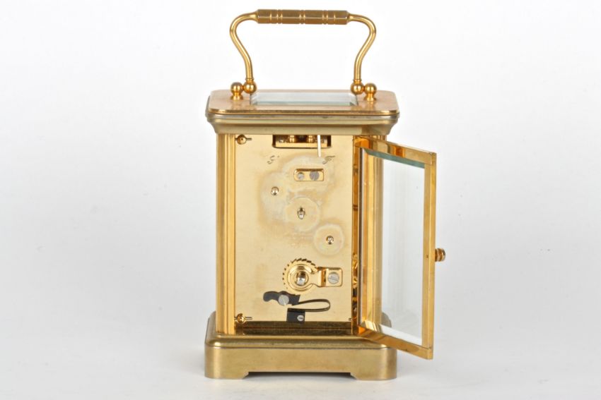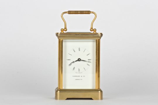 A 20th century Garrard & Co. brass carriage clock with white dial and black Roman numerals, the dial signed Garrard & Co., London, with carrying handle and plain case.Dimensions: 15.5 cm high incl. handle.Condition reportAppears in good condition, but movement not tested.