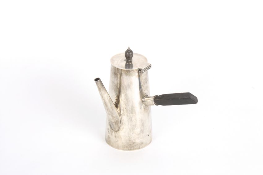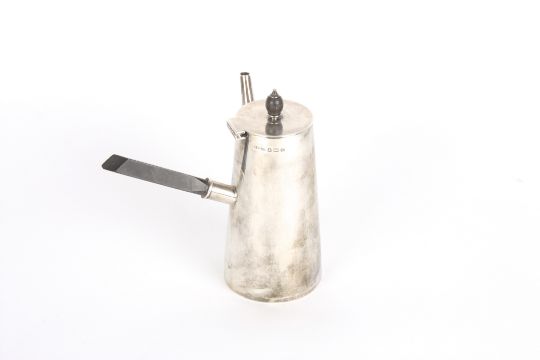 A George V Asprey silver chocolate pot hallmarked Birmingham 1916, with ebonised handle and knop and tapered body. Makers mark: Asprey & Co.Dimensions: Weight: 10.7 ozt. 17cm high.Condition reportFew small dents, otherwise good condition.