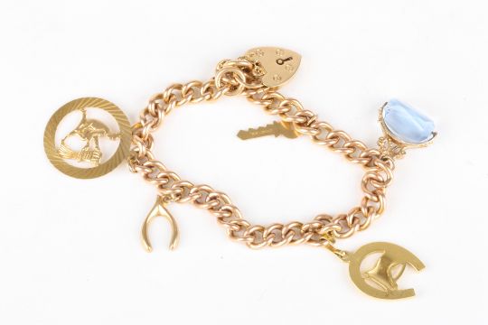 A 9ct gold charm bracelet set with five charms and a padlock clasp.Dimensions: 36.2 grams total.Condition reportGood condition.