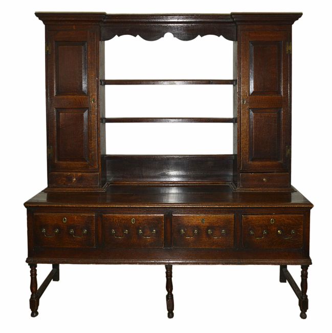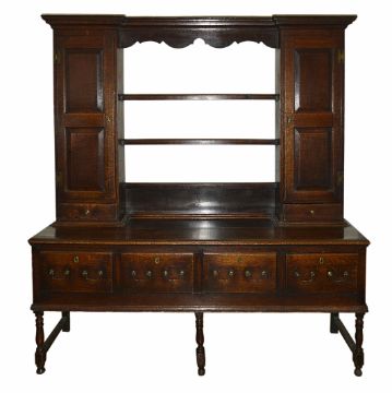 An 18th century oak dresser the top with open plate rack flanked either side with a panelled door and drawer, supported on a base of four small drawers with brass handles and supported on turned legs.Dimensions: height 190cm., overall width 185cmCondition report