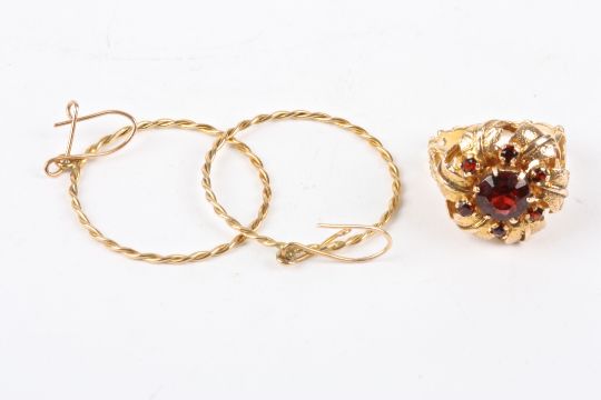 A 9ct gold and garnet cluster ring of floral form, with large central garnet surrounded by leaves and smaller garnets; together with a pair of 9ct gold wire twist earrings.Dimensions: 7.9 grams.Condition report