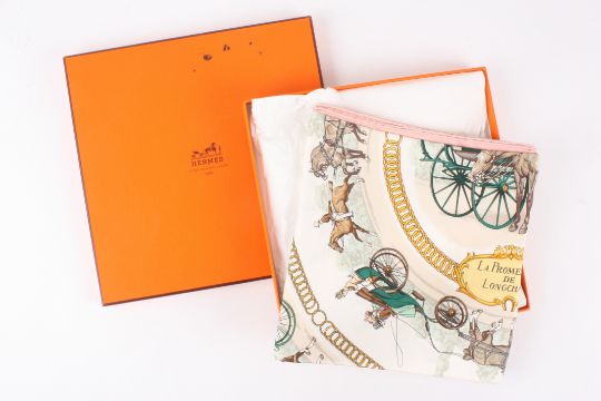 A Hermès of Paris silk scarf 'La Promenade de Longchamps' decorated with a central scene of a horse and carriage by Ledeoux, surrounded by smaller coaching vignettes on a pink ground with rolled edge. In original orange Hermès box.Dimensions: 89 cm square.Condition reportGood condition, box with few marks.