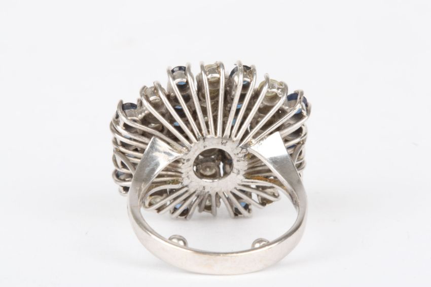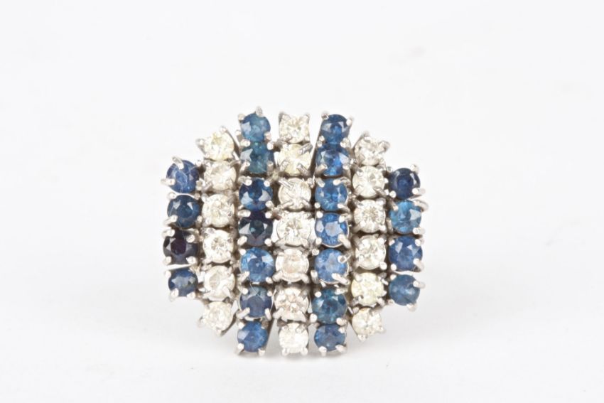 A large 18ct white gold, sapphire and diamond cluster dress ring set with four rows of sapphires interspersed with three rows of diamonds, the mount marked 18ct.Dimensions: Resized to an H. 11.1 grams.Condition reportGood condition, shank with applied ball re-sizing.