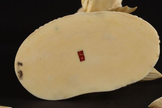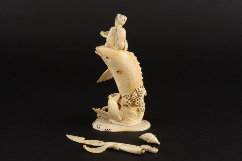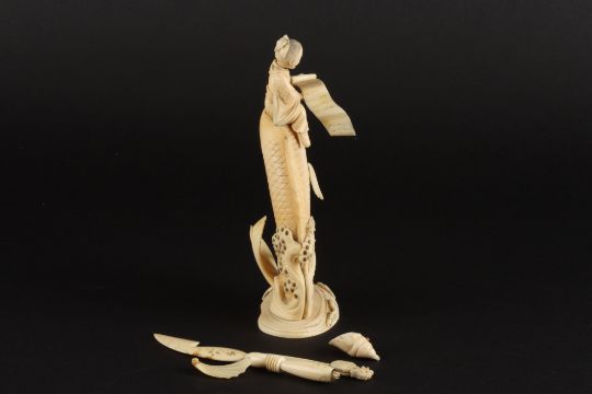 A Japanese ivory figure of a fish and a man the large carved fish having jumped from the coral and sea bed below, surmounted by a seated Japanese figure of a gentleman reading from a scroll, together with a small ivory knife and an ivory book mark with figure of an IndianDimensions: height 19cmCondition reportThe fish with one loose fin and a loose shell. would benefit from minor repairs.