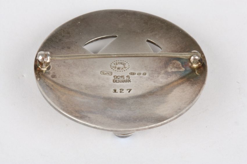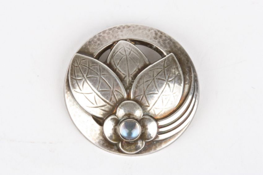 A Georg Jensen silver and moonstone circular brooch formed as a flower head and leaves, of domed form, impressed marks to the reverse and numbered 127.Dimensions: 4 cm diameter.Condition reportGood condition, no damage.