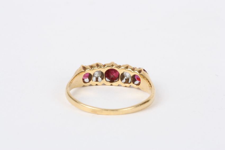 An 18ct gold, ruby and diamond five stone ring set with three rubies interspersed by two diamonds, in a claw mount.Dimensions: Size P.Condition reportGood condition although marks rubbed.