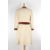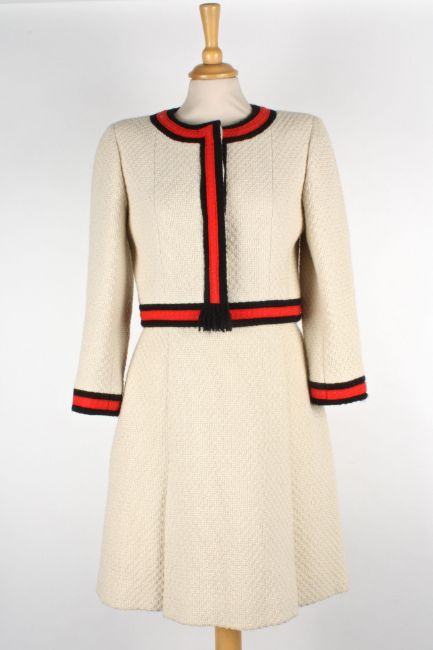 A cream Chanel wool skirt suit the jacket with round neck and black and red trim to edges and cuffs, with logo buttons to front, and Chanel branding to left cuff and skirt top, with fringe to base of front jacket, with matching skirt with box pleat to front and back, European size 40 Dimensions: Condition reportIn good overall condition. Lined 98% wool.