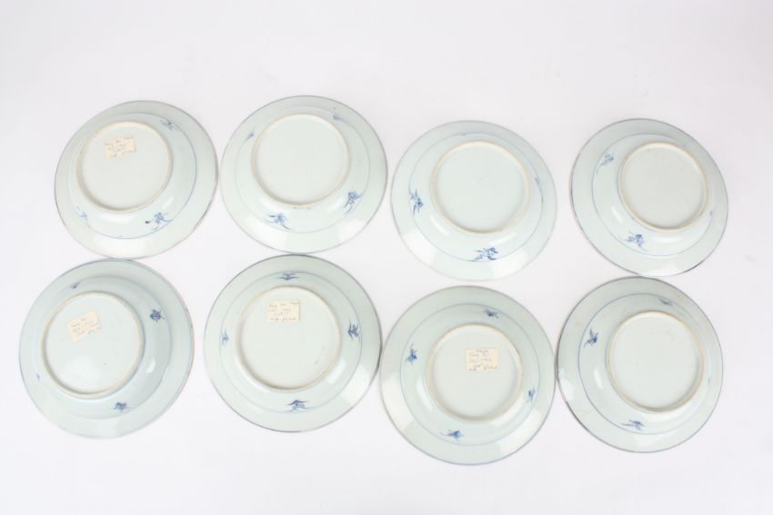 A set of eight 19th century Chinese blue and white bowls each painted with a central panel of flowers surrounded by borders of flowers, the bases unmarked. Dimensions: 22.5 cm diameter.Condition reportFive cracked, several with chips.