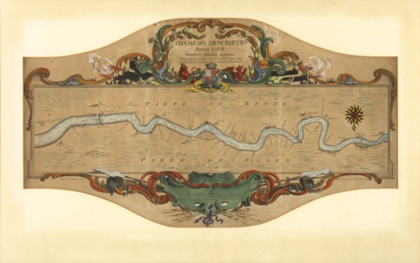 An unusual 18th century Map of the Thames 'Thamesis Descripio Anno 1588, showing Essex and Kent from an unusual perspective with North reversed, hand coloured, 'Roberto Adamo authore, Engraved from a copy drawn by Mr. Joseph Ames the 8th of April 1738 from the Original in Parchment, in a shaped mount and framed.Dimensions: Image 38 x 67 cm.Condition reportCreased to centre, few small losses to the top, light foxing in places.