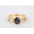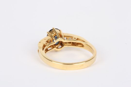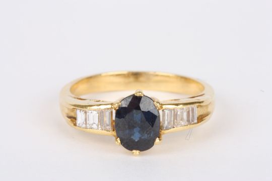 A sapphire and diamond ring set with large central oval sapphire, flanked either side by three small baguette cut diamonds. Set in unmarked yellow metal, probably gold.Dimensions: Size 'O' Condition reportGood condition.