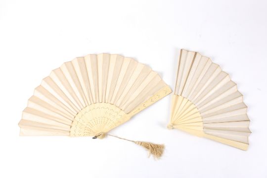 Two silk and bone fans the first with bone sticks and guard sticks, with silk fan hand painted with floral spray including forget-me-nots, the second with pierced bone sticks and embroidered silk fan decorated with floral sprayDimensions: the former length 28.5cmCondition reportThe first with some minor staining particularly around the edges and some fraying to the base of the silk, the second with some fraying to base of silk near the top of the guard sticks and some lights staining to material.