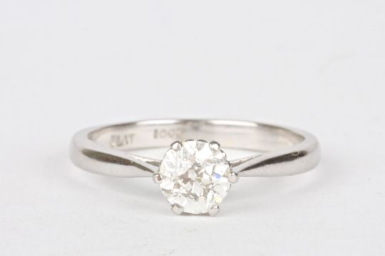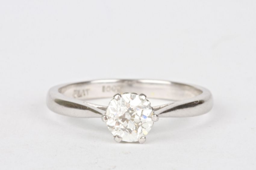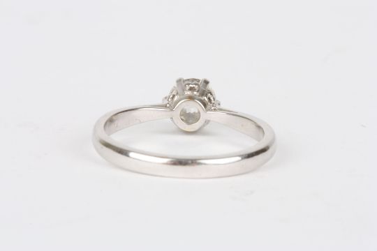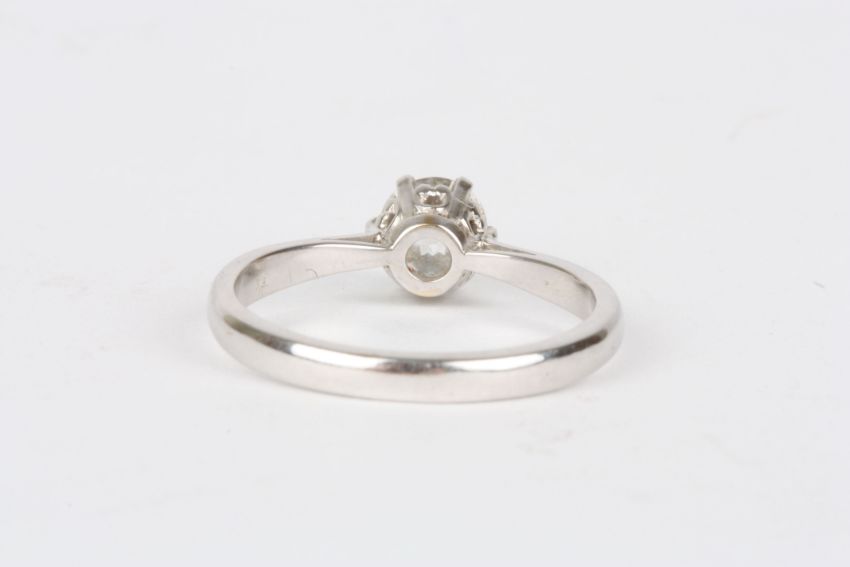 An 18ct white gold and platinum diamond solitaire ring the old cut diamond weighing approximately 0.65-0.70cts in a six claw mount.Dimensions: Size Q.Condition reportGenerally good condition.