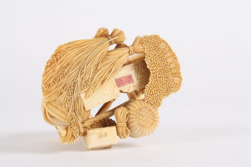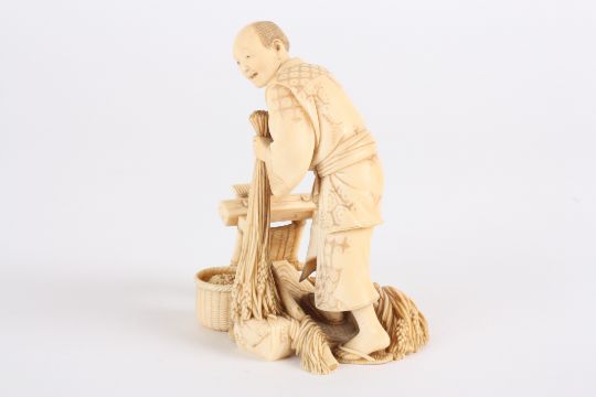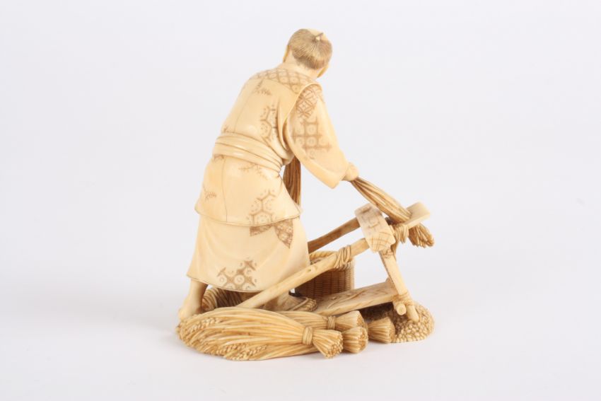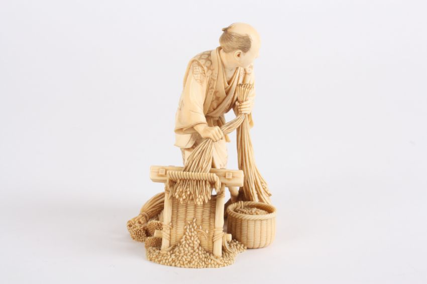 A Japanese finely carved ivory figure of a man stood threshing corn using a foot operated machine, and supported on an open base strewn with corn, a basket and box. Red wax inset signed tablet to base. Dimensions: 8.25 cm high.Condition reportExcellent condition.