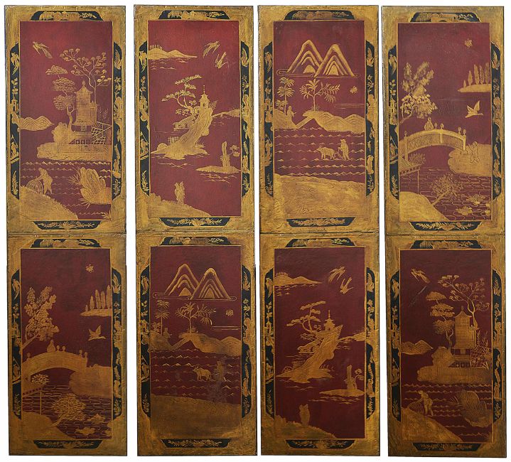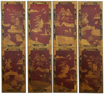 Four decorative lacquered panels each panel decorated with oriental scenes depicting temples, birds, trees, river scenes and figuresDimensions: height 180cm, width 47cmCondition reportWith some wear to lacquer and general wear. Would benefit from being fixed back together