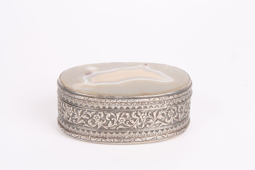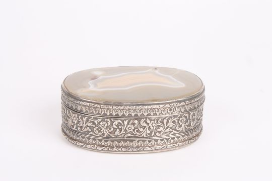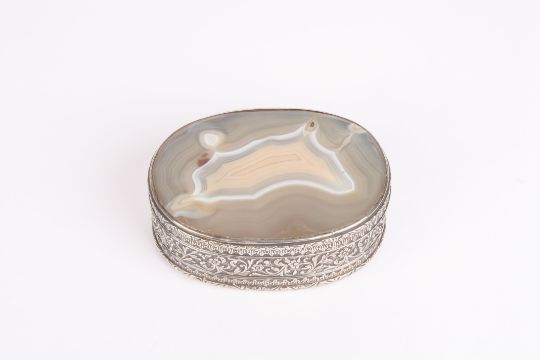 A variegated agate trinket box of oval form in chased and repoussé silver coloured metal mountDimensions: 13cm longCondition reportLid is a little loose. In fair condition