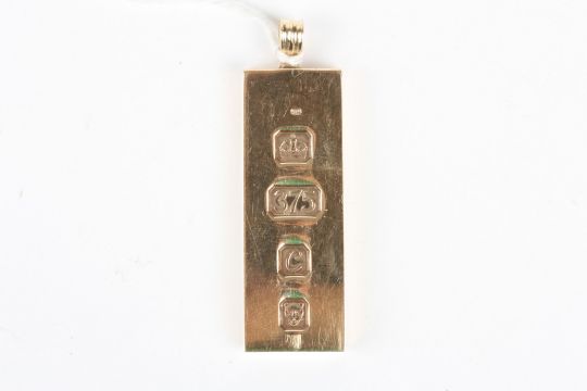 A 9ct gold ingot of rectangular pendant form, hallmarked London 1977.Dimensions: 29.8 grams.Condition reportGood condition.