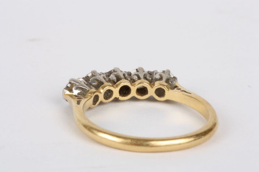 An 18ct gold and diamond five stone ring set with five circular diamond weighing approximately 0.16-0.18cts each, set in platinum.Dimensions: Size T.Condition reportGood condition.