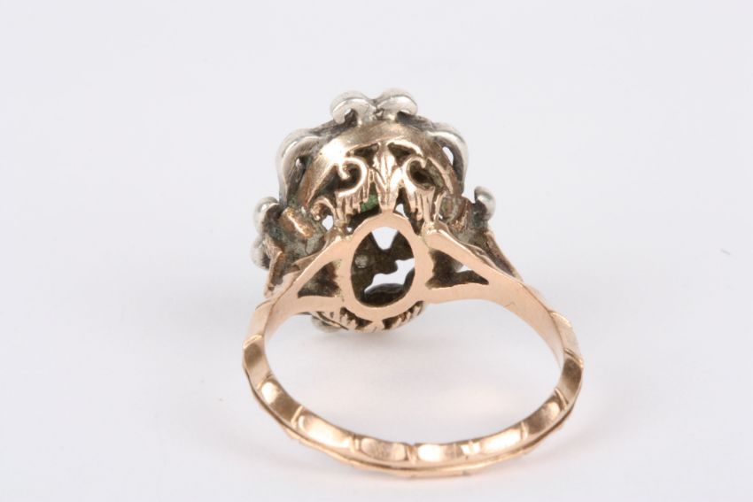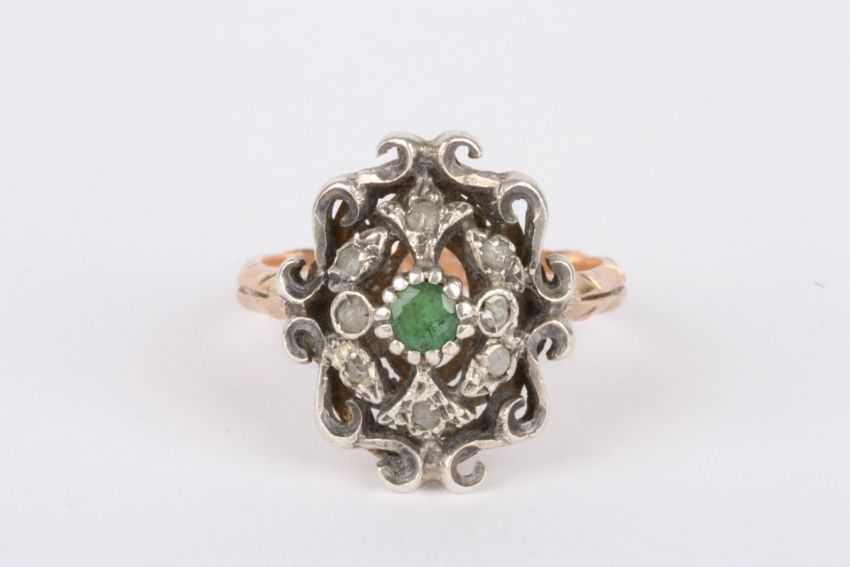A 19th century Continental diamond and emerald ring of shield form with centre emerald surrounded by rose diamonds in white metal possibly silverDimensions: size 'O'Condition reportWith two stones missing (rose diamonds)