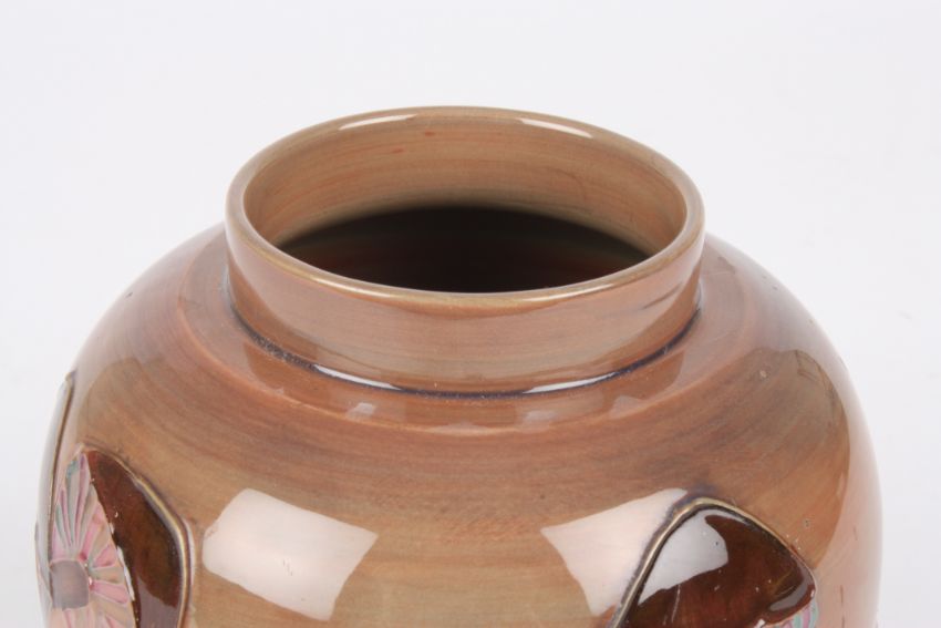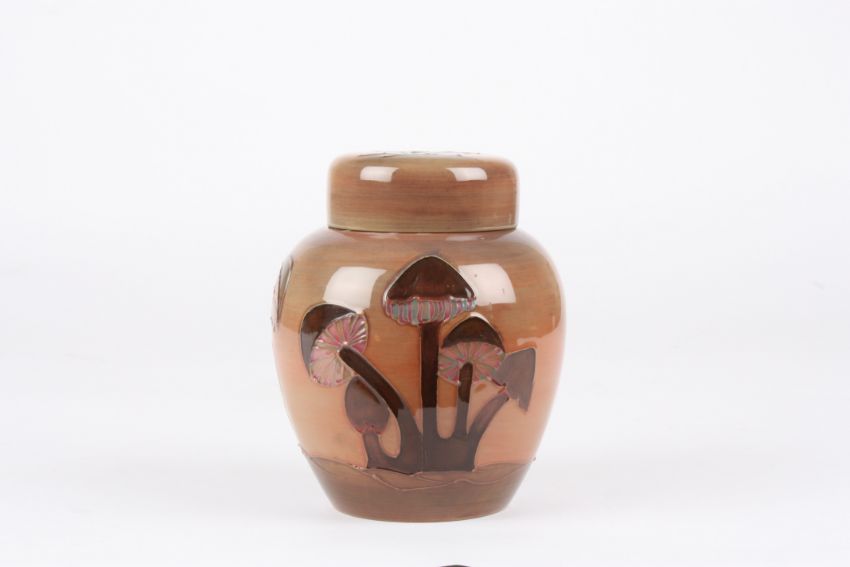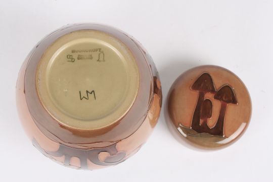 A Moorcroft Mushroom Brown ginger jar and cover the body and lid decorated with mushrooms on a graduated pink and brown ground, the base impressed Moorcroft and dated 1991 and painted WM mark.Dimensions: 15.5 cm high.Condition reportGood condition, no damage, some crazing in places.