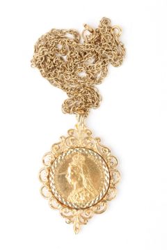 A Victorian 1889 22ct gold full sovereign in an ornate foliate 9ct gold mount, on a 9ct gold chain.Dimensions: 21.4 grams total.Condition reportGenerally good condition, scratch near Victoria's face.