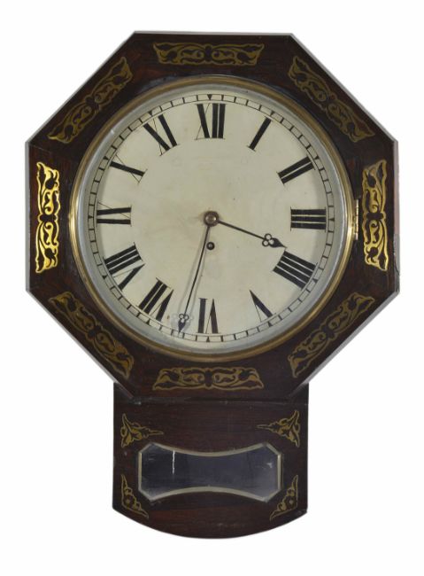 A brass inlaid rosewood trunk dial wall timepiece mid 19th century the 12-inch painted dial with Roman numerals, fusee movement, the rosewood case of octagonal form with mounted pierced brass and pendulum aperture belowDimensions: length 53cmCondition reportThe dial with some restoration. Would benefit from a clean and overhaulProvenanceSothebys 'Ken Paul Prop Art' lot 174, 2002