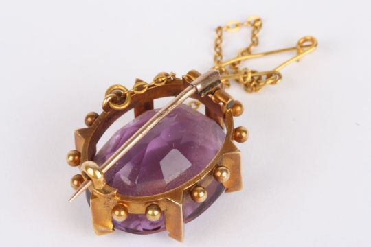 A Victorian amethyst oval brooch set with large faceted amethyst, in a yellow metal six claw mount with safety chain.Dimensions: 7 grams.Condition reportGenerally good condition, one claw bent.