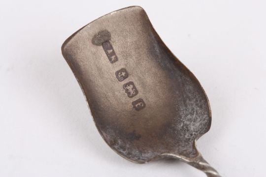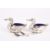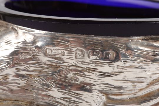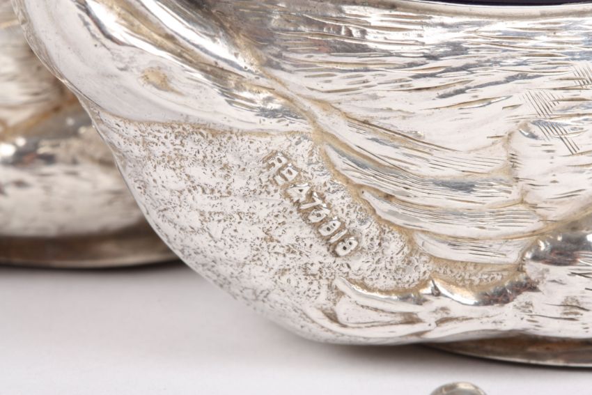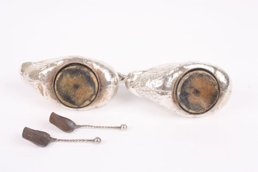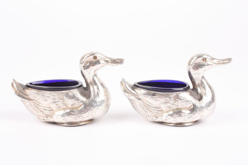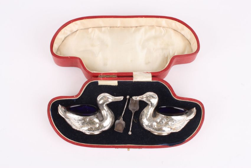 A pair of Edwardian novelty silver duck shaped salts hallmarked Birmingham 1905, realistically modelled as ducks in swimming poses, with blue glass liners in their backs, makers mark Henry Williamson Ltd. Presented in a fitted red leather case, with associated spoons.Dimensions: 9.5 cm long.Condition reportBoth with missing eyes, some wear in places, one with split beak, holes to the neck and dents to the tail feathers.