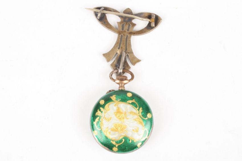 An Edwardian ladies silver gilt and green enamel pendant fob watch the engine turned green enamel decorated with gilt flowers, with white enamel dial, suspended from a shaped ribbon pin hanger.Dimensions: Watch case 2.75 cm.Condition reportMinute land detached, some light enamel damage in places.
