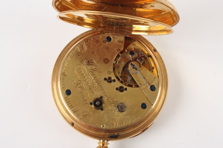 A Victorian 18ct gold pocket watch by Hargreaves of Liverpool hallmarked Chester 1883, the white enamel dial with black Roman numerals and signed Hargreaves & Co., Liverpool, Makers to the Queen & H.R.H. The Prince of Wales, with separate seconds hand, the case with engraved floral decoration, the back plate signed and numbered 47619. With leather Albert and key.Dimensions: Overall weight approx 143 grams.Condition reportSome light case wear, small chip to glass, no visible damage, movement not tested but winds and appears to run okay.