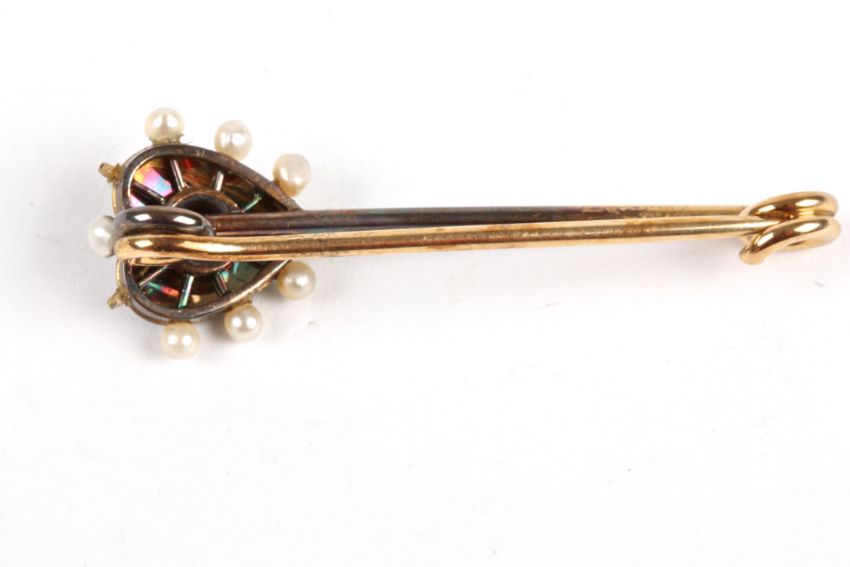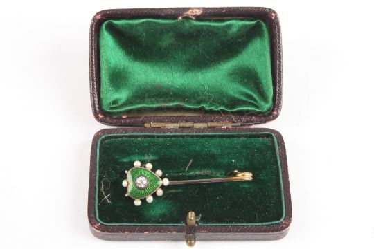 A Victorian diamond and enamel bar brooch set with green enamel heart surrounded by seed pearls and mounted in the centre with a diamond weighing approximately 0.10cts, set in unmarked yellow metal.Dimensions: 4.25 cm long.Condition reportMissing two pearls.