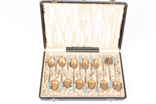 A set of twelve silver gilt and enamel coffee spoons by David Andersen, Stockholm the stems with scrolled decoration in relief and turquoise enamel, marked .925, in an Andersen fitted box.Dimensions: 9.25 cm long. 3 ozt.Condition reportA little worn in places.