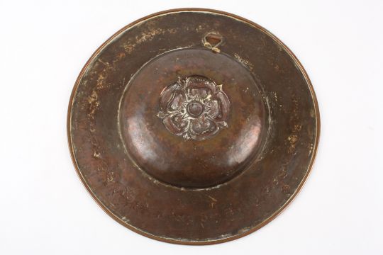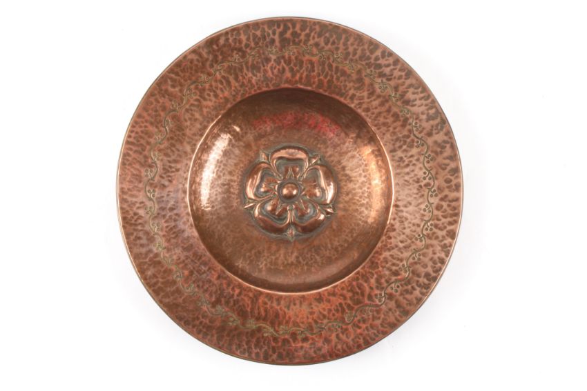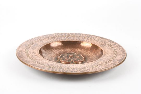 An Arts and craft Copper bowl with hammered design and tendrils to edge, and embossed Tudor rose to centre Dimensions: diameter 26cmCondition reportSome wear with age but generally in good condition